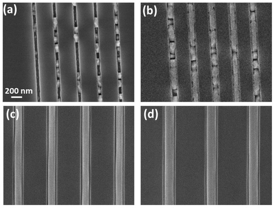 First, the growth of GaP buffer layers on (001) GaP substrates into trench patterns of different width, from 50 to 200 nm, was tested. Figure 1 shows the top-view SEM images of the different patterns after 1 h of GaP growth. It is quite clear that the GaP growth occurs only into the trenches, while there is no deposition on the SiO2 mask that looks perfectly clean. This confirms that CBE is a highly suitable growth technique for the SAG of III–V semiconductors on dielectric-patterned substrates [24]. However, we found that the growth in the thinner trenches (with a nominal width of 50 and 100 nm: panels (a) and (b), respectively) resulted in separated GaP islands, while the growth into the wider trenches (with nominal width of 150 and 200 nm: panels (c) and (d), respectively) resulted in a continuous GaP layer filling the whole trenches for their total length. The different morphology can be either a result of different growth modes for mask openings of different width or a possible consequence of a less efficient etching procedure for very thin lines. Since a detailed investigation and optimization of the process for the thin trenches was beyond the scope of the present paper, in the following we focus our attention only on the larger trenches that are still suitable for the growth of high-quality thin InAs layers, as will be shown. Here, we could measure a GaP thickness of 120 nm, resulting in a growth rate of 2 nm/min.