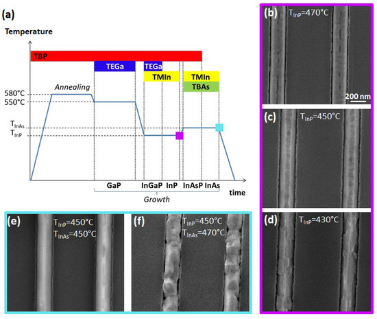 Growth protocol and samples obtained at different stages of the growth sequence: at the end of InP layer growth (violet framed) and at the end of InAs growth (cyan framed) for different temperatures. (a) Schematic view of the complete growth process. (b–d) Top-view SEM images of the GaP/InGaP/InP layers grown on the 200 nm wide trenches for different TInP: 470 °C (b), 450 °C (c), and 430 °C (d). (e,f) Top-view SEM images of the GaP/InGaP/InP/InAsP/InAs samples obtained at TInP = 450 °C and TInAs = 450 °C in (e) and 470 °C in (f). The scale bar (200 nm) is the same for all panels.