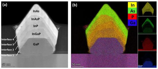 (a) STEM-HAADF image of the entire heterostructure in cross-section. The different interfaces are indicated by white arrows and numbered from 1 to 4, following the growth sequence. (b) Overlapped EDX map of the same heterostructure depicted in (a) with the single element maps as insets on the right.