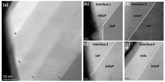 (a) HRSTEM image of a portion of the structure containing all of the heterointerfaces as indicated (1–4) on the (111) inclined plane. (b–e) HRSTEM images of a portion of each heterointerface.