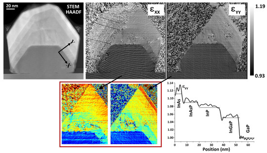 To analyze the strain distribution in the cross-section, STEM-HAADF images were processed by geometric phase analysis (GPA). Figure 6 shows the obtained maps for the strain components parallel (εxx) and perpendicular (εyy) to the heterointerfaces. Only a portion of the heterostructure is visible, due to twinning that causes the crystalline lattice on the left side of the structure to give reciprocal space spots in different positions with respect to its right side. The values start from 1, corresponding to GaP [32]. Looking at the εyy map, an abrupt change is observed across each interface, allowing one to clearly identify the complete layers sequence. Looking instead at the εxx map, a sharp contrast is found at the first two interfaces, i.e., GaP/InGaP and InGaP/InP, where a few dislocations occur, while a gradual increase takes place in the topmost material (InP/InAsP/InAs layers). This observation of different behaviors between εxx, increasing by gradual increments, and εyy, increasing by sharp jumps, is indicative of some residual tetragonal distortion in the topmost layers [33]. However, this distortion is indeed small. In fact, the integrated line profile of εyy (Figure 6 bottom right) shows a good match between the experimental values (solid line) and the expected values (dotted segments), calculated from the ratio to GaP of the relaxed lattice parameters of each layer, assuming a composition profile as measured by EDX spectroscopy. Overall, the strain analysis highlights that the adopted growth approach by buffer layers in the sequence GaP/InGaP/InP/InAsP/InAs is effective to have an efficient strain relaxation.