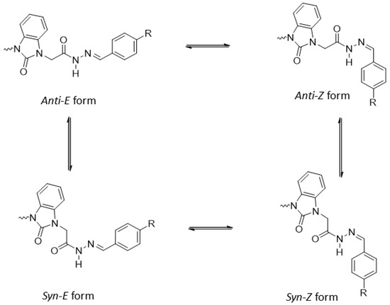 Acetohydrazide hydrazones can exist in solution as a mixture of (configurational and conformational isomers) Z-E and syn-anti, respectively. The ratio of these isomers is dependent on many factors, such as the nature of the solvent and their chelation ability [52] (Figure 2 and Figure S1, Table 1 and Table S2).