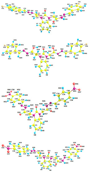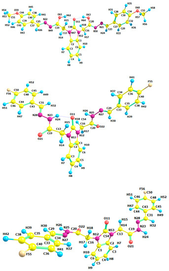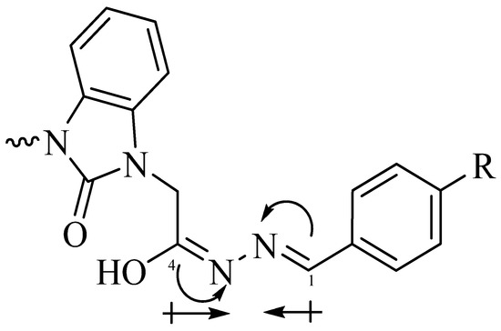 The optimized geometrical parameters (bond length, angles and dihedral angles) are listed in Table 3. The numbering of atoms for the optimized geometries of amido-forms of 2,2′-(2-oxo-1H-benzo[d]imidazole-1,3(2H)-diyl)bis(arylideneacetohydrazide) are shown in Figure 7.