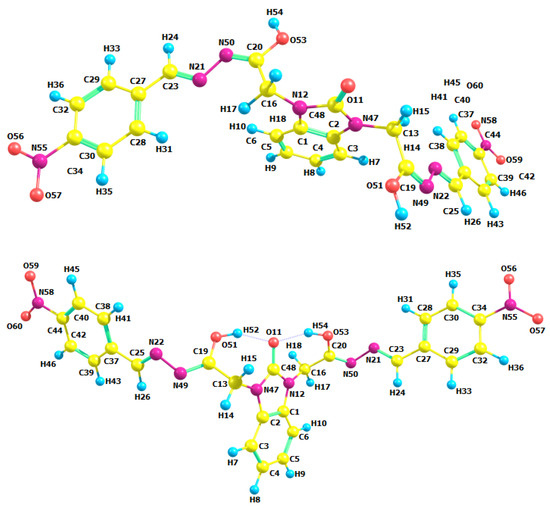 As previously reported, ref. [21] acetylhydrazones can exist in solution as a mixture of (configurational isomers and conformational isomers) Z-E and syn-anti, respectively. The ratio of these isomers is dependent on many factors, including the nature of the solvent and their chelation ability [52]. On the other hand, their X-ray spectra revealed the presence of only the syn-E isomer [52,53] where the CO and NH groups permit maximum intermolecular hydrogen bonding.