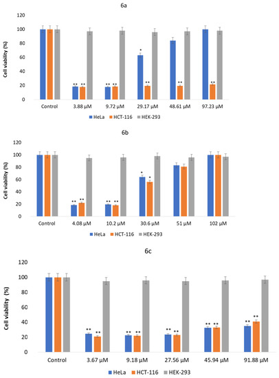 Cell viability with the MTT Assay. Cell viability shows the average impact of samples 6a (3.88 to 97.23 µM), 6b (4.08 to 102 µM), and 6c (3.67 to 91.88 µM) on HeLa cells, HCT-116 cells, and HEK-293 cells 48 h after treatment. * p < 0.05; ** p < 0.001.