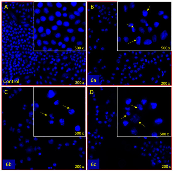 DAPI is a fluorescent dye that stains DNA and can thus be used to detect nuclear damage, which is one of the hallmarks of apoptotic cells [71,72,73]. Treatment with samples 6a, 6b and 6c caused an increase in nuclear condensation, shrinkage of nuclei and loss of shape of the nuclei compared to the control (Figure 10A–D), which suggests an increase in programmed cell death (i.e., apoptosis). We also analyzed the cervical cancer cells (HeLa) by DAPI staining. Treatment with samples 6a, 6b, and 6c caused an increase in nuclear condensation, shrinkage of nuclei and loss of shape of the nuclei compared to the control (Figure 11A–D).