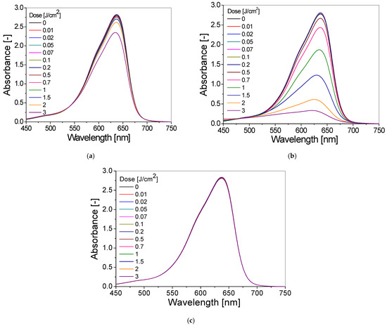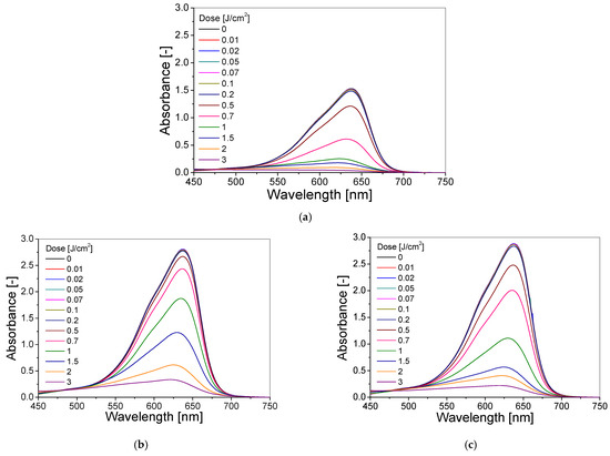 The chosen TBO–Pluronic F–127 gel dosimeter (composition 3; see Table 1) has been characterized more widely. The absorption spectra of this gel irradiated with UVA, UVB and UVC radiation are presented in Figure 3. Exposure of TBO–Pluronic F–127 gel dosimeter to UV radiation causes a discolouration of the blue gel, and bleaching is greater the higher the absorbed dose. It is expressed as a decrease in absorbance value with an increasing absorbed dose in the wavelength range of 525–700 nm with a maximum at 638 nm (Figure 3). The most intense colour fading of the gel samples occurs during irradiation with UVB (Figure 3b) and the weakest during exposure to UVC light (Figure 3c). For instance, the absorbance at 638 nm of the sample irradiated with 1 J/cm2 of UVB radiation is 32% and 34% lower than the absorbance of samples irradiated with the same dose of UVA and UVC radiation, respectively (Figure 3a–c).