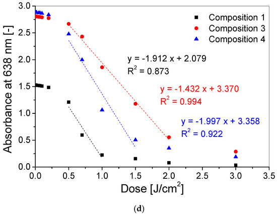 Further in this study, three dosimeter compositions (1, 3 and 4; see Table 1) were selected to assess the effect of TBO and H2O2 concentrations on the UVB dose–response of the dosimeter (Figure 2). The same threshold dose (0.01 J/cm2) and dynamic dose range (0.01–3 J/cm2) were obtained for all compositions, and the dose sensitivities (slopes of the linear regressions of Absorbance = f(dose)) were equal to −1.912 ± 0.498 cm2/J, −1.432 ± 0.057 cm2/J and −1.997 ± 0.331 cm2/J for compositions 1, 3 and 4, respectively (Table 2). Composition 3 was characterized by a wider linear dose range (0.5–2 J/cm2) compared to composition 1 (0.5–1 J/cm2) and composition 4 (0.5–1.5 J/cm2) (Table 2). After analysing the results, composition 3 was selected for further research because of the higher absorbance of the non-irradiated sample compared to composition 1, and wider linear dose range and a correlation coefficient (R2) closer to 1 compared to composition 4.