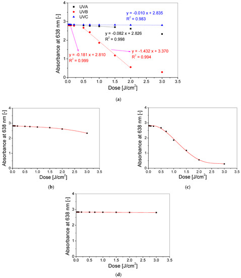 On the basis of the absorbance spectra (Figure 3), the dose–response characteristic was prepared, expressed as a relation between the absorbance at a specific wavelength (at which the absorption spectrum of the gel was maximal) and the absorbed dose (Figure 4a). Following this, the basic parameters for the dosimeter exposed to various types of UV radiation were extracted and presented in Table 3.