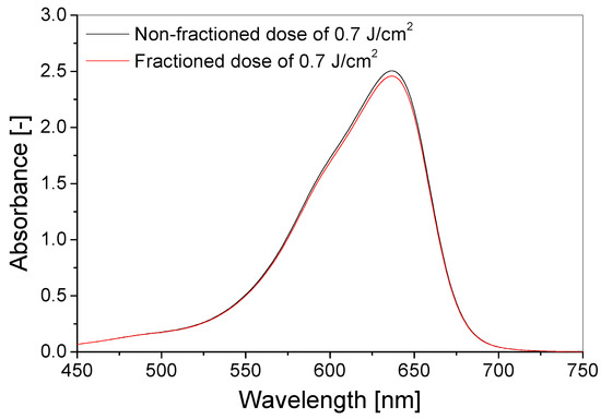 The dose–response of the TBO–Pluronic F–127 dosimeter was also assessed for the dose of 0.7 J/cm2 UVB delivered fractionally and non-fractionally (Figure 5). The fractioned dose was given in seven fractions of 0.1 J/cm2, and the gap between fractions amounted to approximately 3 min. The gels were measured immediately after irradiation. Judging by the results obtained, dosimeters react similarly to different irradiation methods applied. The absorbance at 638 nm was 1.9% higher for the dosimeter irradiated with a non-fractioned dose than with a fractioned dose of UVB.