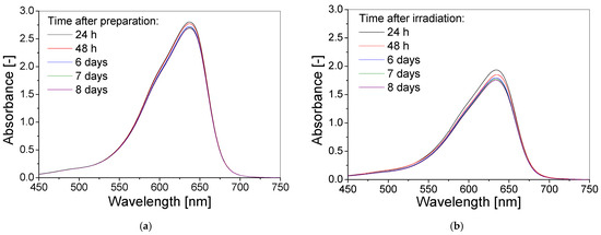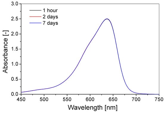 The stability over time of the TBO–Pluronic F–127 gel dosimeter was examined based on the spectrophotometric measurements. In the first step, the stability of the gel dosimeter solution was assessed after preparation. The solution was kept in a refrigerator (4 °C) throughout the 7 day measurement period. It was poured into a cuvette 1 h before measurement and stored at room temperature to form a physical gel. The overlapping dosimeter spectra (Figure 6) are evidence of the stability of the gel solution for at least 7 days after preparation when kept in the refrigerator.