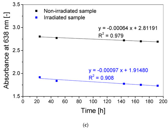 Further in this research, the stability over time of storage of the non-irradiated and irradiated TBO–Pluronic F–127 gel samples were examined. During the experiment, the samples were stored at room temperature. The results obtained show that the non-irradiated TBO–Pluronic F–127 gel dosimeter was more stable than the irradiated one (Figure 7). The absorbance at 638 nm of the TBO–Pluronic F–127 gel dosimeter decreases by 4% and 9.7% for non-irradiated and irradiated gels, respectively, within an 8 day period. In both cases, the decrease in absorbance is linear in the studied time range (Figure 7c).