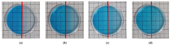 The possibility of using the TBO–Pluronic F–127 gel dosimeter for 2D/3D dose distribution measurements of UV radiation was investigated. In this respect, an experiment was conducted in which half of the dosimeter was irradiated with UVB radiation, and the other half was not irradiated. Photographs of the dosimeter sample over time after irradiation are shown in Figure 8, where the red line separates the irradiated part from the non-irradiated part. The obtained results indicate that diffusion from the irradiated to the non-irradiated part takes place soon after irradiation, and it occurs in the entire volume of the sample 8 days after irradiation. For this reason, the dosimeter allows reliable measurements to be made up to 1 h after irradiation. Therefore, in further work, the chemical composition of the dosimeter should be modified to obtain greater stability, which is required for a reliable evaluation of the 2D/3D dose distribution.