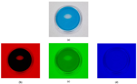 The TBO–Pluronic F–127 gel sample irradiated in the designated ellipse-shaped part (a) and decomposed into RGB channels: red (b), green (c) and blue (d).