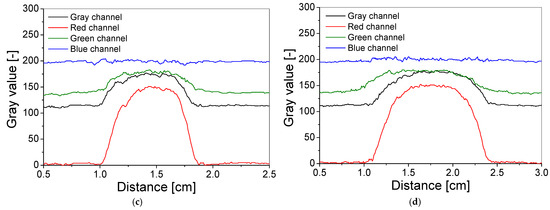 The profiles across and along the sample were plotted, as shown in Figure 10c,d. The increase in intensity for the raw sample (grey channel) corresponds to the irradiated part of the sample, which became discoloured. The greatest increase in colour intensity was observed for the red channel, which best illustrates the changes occurring in the sample after irradiation. The changes are not visible for the blue channel due to the analogous colour of the sample. The obtained results clearly indicate the possibility of using TBO–Pluronic F–127 to record the 2D dose distribution. It is also possible to extend the recording to 3D dose distribution measurements using a 3D optical scanning technique, which is planned for subsequent studies.
