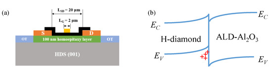 (a) Schematic diagram of the MOSFET; (b) energy band diagram of H-diamond/Al2O3 without gate bias.