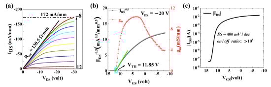Figure 3 shows the electrical characteristics. The IDS-VDS curve is shown in Figure 3a. The gate-source voltage (VGS) varies from 12 V to −8 V in steps of −2 V. The maximum current density is 172 mA/mm at VGS = −8 V; VDS = −30 V. This value is much higher than that we reported based on the homoepitaxial diamond substrate previously [15,16]. It demonstrates the application potential of heteroepitaxy diamond to electronic devices. The on-resistance (RON) is evaluated to be 130.5 Ω∙mm. As displayed in Figure 3b, the threshold voltage (Vth) is deduced to be 11.85 V, demonstrating a normally on performance which is obtained according to the relationship of and VGS. The maximum transconductance gm (max) is 10.4 mS/mm. Figure 3c exhibits the relationship of log(|IDS|) and VGS. The subthreshold slop and on/off ratio can be observed to be 400 mV/dec and 105.
