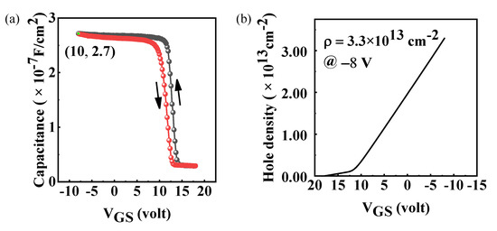 where ∆W is the work function difference between H-terminated diamond (4.9 eV) [20] and the Ti (4.3 eV) gate electrode, e is the elementary charge of 1.6 × 10−19 C; therefore, the Nfc in Al2O3 layer can be determined to be 1.66 × 1013/cm2. The trapped charge density can be calculated to be 4.03 × 1012/cm2 according to the hysteresis loop (∆VFB = 2.6 V). Figure 4b shows the relationship between the hole density (ρ) and VGS. The carrier density can be evaluated by ρ = (∫CdV)/e, and the result is 3.3 × 1013/cm2 obtained at VGS = −8 V. A linear tendency reveals a uniform carrier distribution of H-diamond.