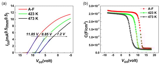 (a) transfer curve of MOSFET as-fabricated(A-F) and after annealing process at 423 K and 473 K for 3 min (b) C-V curve of MOSFET as-fabricated(A-F) and after annealing 150 °C and 200 °C process for 3 min.