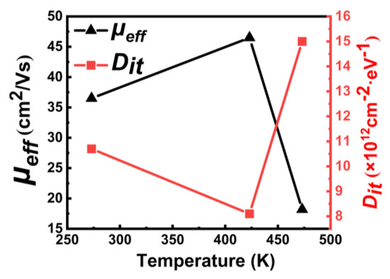 To investigate the effect of low-temperature annealing on electrical properties of the MOSFET, the sample was annealed in N2 ambient at 423 K and 473 K for 3 min, sequentially. Threshold voltage (Vth) shifts negatively with increasing annealing temperature, as shown in Figure 5a. In Figure 5b, the C-V curve shifts to the negative direction. Additionally, the VFB for each curve can be extracted to be 9.1 V (red), 6.8 V (green), and 3.3 V (black), respectively. The negatively shifted VFB indicates that the annealing process decreases the negative charge density at the Al2O3/H-diamond interface [22]. The loss of negative charges which can induced holes beneath the diamond surface results in negatively shifted Vth, as shown in Figure 5a. Figure 6 presents the μeff at Vth − VGS = 2 ± 0.2 V and Dit as a function of annealing temperature. Obviously, all μeff and Dit values show completely inverse trends, which means that μeff strongly depends on Dit. When Dit is decreased to 8 × 1012 cm−2·eV−1, the μeff, from 36.5 to 46.5 cm2/Vs, increases by 27% after the annealing process at 423 K. The possible reason is that when the annealing temperature is 423 K, the quality of ALD-Al2O3/H-diamond interface was improved. On the contrary, when the annealing temperature increases to 473 K, the Dit increases dramatically and the μeff decreases sharply. It implies that 200 °C annealing process for 3 min possibly degrades the interface between Al2O3 and diamond [22,23]. After the 200 °C annealing process, the increased Dit which acts as charges at interface results in enhancement of coulomb scattering at the ALD-Al2O3/H-diamond interface.