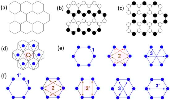 (a) A simplified view of a honeycomb layer made up of magnetic ions. (b) A zigzag order of magnetic moments in a honeycomb layer. (c) A stripy order of magnetic moments in a honeycomb layer. (d) A honeycomb layer of magnetic ions (solid blue circles) in which the center of every hexagon of magnetic ions is occupied by a cation (e.g., Na+ in Na2IrO3, Sb5+ in A3Ni2SbO6, Te6+ in A2Ni2TeO6, (P-P)8+ dimer in NiPS3). (e) First NN spin exchange (J1), second NN spin exchange (J2), and third NN spin exchange (J3) in a honeycomb layer made up of regular hexagons of magnetic ions. (f) First NN spin exchange (J1 and J1′), second NN spin exchange (J2 and J2′), and third NN spin exchange (J3 and J3′) in a honeycomb layer made up of slightly distorted hexagons of magnetic ions (e.g., 2-fold rotational symmetry).
