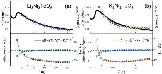 The temperature dependence of the main ESR parameters of (a) K2Ni2TeO6 and (b) Li2Ni2TeO6 derived from fitting the absorption line with the Lorentzian profile: the integral ESR intensity is shown in the upper panel, and the effective g-factor and the ESR linewidth, ΔB, in the lower panel. The orange solid curves represent an approximation in accordance with a modified Huber theory (Equation (5)), as described in the text for (a), and in the framework of Kawasaki–Mori–Huber theory (Equation (6)) for (b).