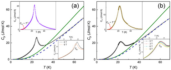 The specific heat, Cp(T), of A2Ni2TeO6 (A = Li, K) has been measured using a relaxation method of a Quantum Design PPMS-9T. The data were collected at the zero magnetic field as well as under applied fields of 3, 6, and 9 T in the temperature range of 2–70 K. The Cp(T) vs. T plots for K2Ni2TeO6 and Li2Ni2TeO6 are shown in Figure 4a,b. A λ-type peak is observed at TN for both K2Ni2TeO6 and A2Ni2TeO6, which clearly shows an occurrence of long-range antiferromagnetic order. These ordering temperatures, TN, coincide with the temperatures at which the peaks of the d(χT)/dT vs. T plot occur (i.e., the Fisher specific heat) [37,38], which is characteristic of low-dimensional antiferromagnets with strong short-range correlations. The positions of TN slightly shift toward the lower temperatures in the applied external magnetic field, as shown in the lower insets in Figure 4a,b, which is typical for antiferromagnetic compounds. To examine the magnetic contribution to specific heat in the title compounds, the Cp(T) curve has been measured for the isostructural non-magnetic system Na2Zn2TeO6. Application of the scaling procedure [39] allows extracting magnetic specific heat, Cm(T), as shown in the upper insets in Figure 4a,b. According to these data, the magnetic entropy, Sm, released below TN is 6.74 and 5.71 J/mol·K for Li- and K-compounds, respectively. These values are to be compared with the thermodynamic limit Sm = nRln(2S + 1) = 18.27 J/mol·K at n = 2 and S = 1, meaning that the dominant part of the magnetic entropy is released above TN.