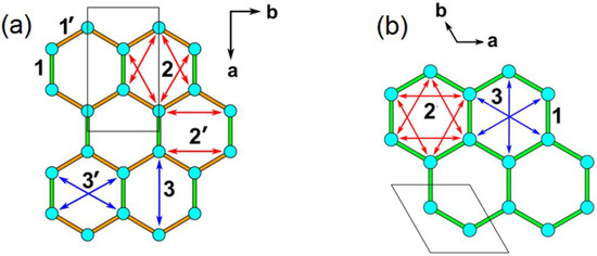 The first, second, and third NN intralayer spin exchanges to consider for Li2Ni2TeO6 and Li3Ni2SbO6 are presented in Figure 5a, and those for K2Ni2TeO6 in Figure 5b. We evaluate these spin exchanges by using the energy-mapping analysis based on DFT calculations [15,20,21]. The three spin exchanges of K2Ni2TeO6 (Figure 5b) were determined using the four ordered spin states of Supplementary Figure S3. Similarly, the six intralayer spin exchanges of Li2Ni2TeO6 and Li3Ni2SbO6 (Figure 5a) were determined using the seven ordered spin states of Supplementary Figures S4 and S5, respectively. In the energy-mapping analysis, we determined the relative energies of the ordered spin states by DFT + U calculations (Supplementary Tables S2–S4), expressed the energies of these states in terms of the spin exchanges (Supplementary Tables S5–S7), and finally mapped the relative energies of the DFT + U calculations to the corresponding relative energies expressed in terms of the spin exchanges to find the values of the spin exchanges.