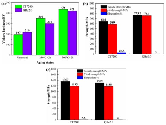 Figure 1 compares the mechanical properties of alloys under varying aging conditions, and Figure 1a illustrates the Vickers hardness of the tested alloys at different aging conditions. For instance, the hardness of C17200 at the initial state was higher than that of QBe2.0, which were 219 HV and 197 HV, respectively. After aging treatment, the hardness values of the alloys were greatly improved, and the hardness values after aging for 2 h at 300 °C were obviously higher than those aged at 280 °C. It is worth noting that the hardness values of C17200 were higher than that of QBe2.0, reaching 436 HV and 421 HV at 300 °C, respectively.