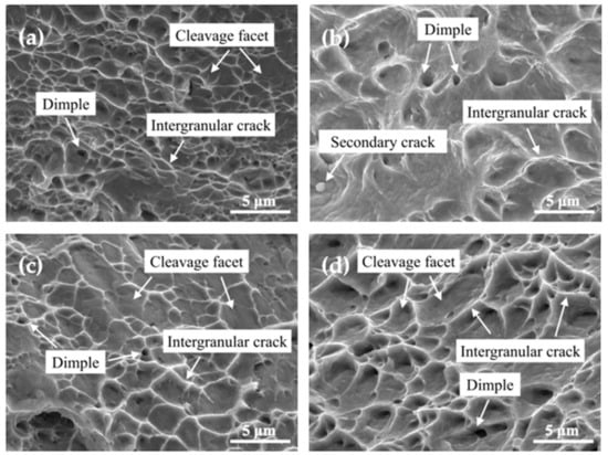 Figure 2 shows the typical fracture morphologies of the tensile specimens under different aging conditions. The alloy fractures all show quasi-dissociative fracture morphologies, with a small number of along-crystal cracks, secondary cracks, and tough nest structures on the dissociative surface [16,17]. Compared with the initial state (unaged), the tough nests of C17200 were denser and deeper than those of QBe2.0, and the elongation is better. The size and depth of the tough nests have a significant effect on the plasticity of the alloy. In the initial state, the tough nests of the C17200 alloy were denser and deeper than those of QBe2.0, and therefore, its elongation was better. In addition, the secondary cracks in QBe2.0 can effectively prevent the movement of dislocations during the tensile process, thus improving the tensile strength of the alloy [18]. As the aging process proceeds, precipitated phases form in the alloys, which are usually harder than the matrix and will not deform unless they are broken or torn from the matrix. This leads to the development of cracks and facilitates the expansion of intergranular cracks. Immediately adjacent to the leading edge of the crack, a cavity similar to a plastic pit is formed as the stress state is essentially three-way, so the crack initiation mechanism comes into play. It can be seen that this type of fracture has the general morphology of a ductile fracture, as if the precipitated phase is not distributed within the grain but is concentrated at the grain boundaries, so that the crack can expand along the grain boundaries, which results in a degree of “plastic along grain” fracture [17]. Therefore, the fracture surfaces of the two alloys after aging show progressively shallower toughness nests and larger deconvolution surfaces, which further explains the gradual decreases in elongation.