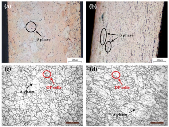 The surface microstructures of the alloys at peak aging are presented in Figure 3c,d. After aging, it can be observed that the microstructures consist of the α phase (the solid solution phase) and a small number of discontinuous precipitation (DP) cells located at the grain boundaries (GBs) of a phase [20]. The crystal grains of the C17200 alloy are more finely and more uniformly distributed in the equiaxed shape, while the crystal grains in the QBe2.0 alloy are distributed in long strips in the matrix. The typical cold-rolled deformation characteristics that evolve into a lamellar structure along the rolling direction are retained in the peak aging alloys, as shown in Figure 3d. The grain size of the C17200 alloy was approximately 0.02 mm, while the grain size of the QBe2.0 alloy was 0.025 mm, and a few were 0.035 mm. Furthermore, DP cells involve the formation of a solute-depleted matrix phase (α’) and a precipitate phase (γ) as a duplex transformation product, and they usually nucleate at the GBs and grow into one side of the supersaturated matrix (the α phase) [21,22]. The DP cells consumed large amounts of solute atoms and contained a coarse equilibrium phase of γ instead of fine metastable γ’ phases, resulting in weakening the precipitation strengthening of the alloy [23,24]. Consequently, the strength of the alloy would decrease with the increase in the volume fraction of DP cells, which is consistent with the relatively lower strength of the QBe2.0 alloy than that of the C17200 alloy.