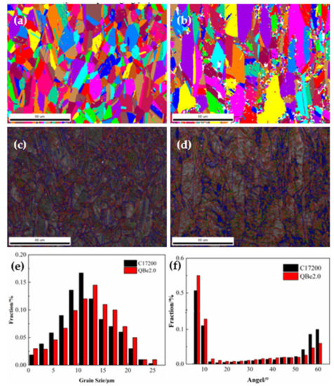 EBSD micrographs and orientation maps of alloys at the peak aging. (a,c) C17200; (b,d) QBe2.0; (e) grain size of the tested alloys; (f) misorientation angle distributions of the tested alloys. HAGBs are shown as blue lines, and LAGBs are shown as red lines.