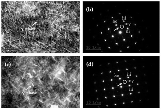 Figure 5 illustrates the TEM images of the tested alloys at the peak aging. Cu-Be alloys are typical age-strengthened alloys, and the α phase is a solid solution of Be in the Cu matrix [29]. It has a face-centered cubic structure and good plasticity. From the TEM bright-field images, it can be seen that a large number of strip-like γ’ phases with lengths of 20–50 nm were dispersed in the matrix, as shown in Figure 5a,c. According to the corresponding SAED maps shown in Figure 5b,d, these elongated strip-like precipitates have obvious habitual planes parallel to the (113)α and (112)α crystal planes of the matrix. The γ’ phase is a metastable phase with a transition structure, with a body-centered tetragonal (BCT) structure, and its lattice constants are a = 0.254 nm and b = c = 0.279 nm [30]. Furthermore, the γ’ phase is in a semicoherent relationship with the matrix, resulting in a large lattice distortion that hinders the movement of dislocations. The observations show that the γ’ phase is the main strengthening phase of beryllium bronzes, and the mechanical properties of the Cu-Be alloys are mainly obtained by precipitating the γ’ phase from the supersaturated solid solution α phase. Therefore, it can be seen that the number density of the γ’ phase in the C17200 alloy is much larger than that seen in the QBe2.0 alloy, indicating that the precipitation is sufficient, which enhances the precipitation strengthening effect and improves the strength of the alloy.