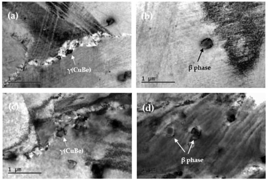 In addition, a large amount of micron-scale β phase material is present in both alloys, as shown in Figure 6b,d. The β phase is a disordered solid solution with a body-centered cubic structure that has the characteristics of high hardness and brittleness. According to the analysis of the phase diagrams, the β phase is stable only above 605 °C, and the transformation process of the β phase is very fast and can only be suppressed during solution treatment [36]. Comparing the two alloys, the size of the β phase in C17200 is 0.05–0.2 μm, while the size of the β phase in the QBe2.0 alloy is 0.5–0.8 μm, and its number is significantly larger than that of the C17200 alloy, which reduces the effect of precipitation strengthening. This is consistent with the previous microstructural observations of the alloys. At the same time, the large precipitates will act as the core of microcrack nucleation and reduce the plasticity of the material in the process of plastic deformation, thereby decreasing the elongation of the material with aging.
