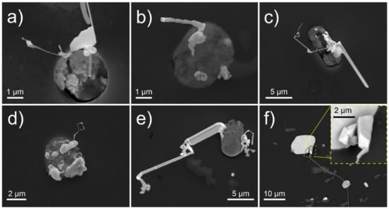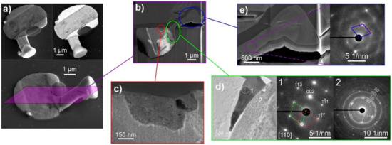 For the imaging of phases in the samples (whiskers) in a cross-sectional manner with the use of a focused ion beam—scanning electron microscope (FIB-SEM) Helios Nanolab 650 FEI, Hillsboro, OR, USA, at the Center of Excellence in Nanoscience and Nanotechnology—Nanocenter (CENN—Nanocenter). Samples (lamellas) for (scanning) transmission electron microscopy (S)TEM were also prepared with FIB. In the first step of the lamella preparation, samples were protected with a 300 nm thick electron deposited Pt layer and an additional 2.5 μm thick ion deposited Pt layer, which were deposited on top of each other at the selected ion acceleration voltages/beam currents of 20 kV/1.6 nA and 30 kV/0.4 nA, respectively. In the second step, lamellas were extracted from the sample and transformed into the Cu TEM grids with the use of an OmniProbe 200 micromanipulator. The third step comprised of thinning the lamellas from the initial thickness of 2 μm to the electron transparency (thickness of ≈30 nm). In the final step, the lamellas were cleaned with low kV ions/low beam current (0.5 kV/50 pA) for 1 min on each side, enabling the removal of the amorphous residue and Ga artifacts.