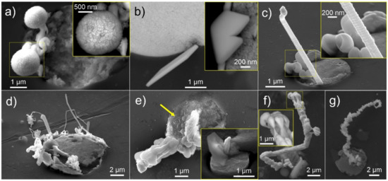 Secondary electron and back-scattering electron micrographs depicting typical examples of (a) bubbles displaying cotton ball-like morphology, (b) plates and facets, (c) whisker with enlargement indicating the growth serrations and (d) groupings constructed of several short whiskers intertwined with blob formations. (e) Typical hydroxide plate-like formations (marked with yellow arrow) formed on samples in an environment with high humidity. In (f,g), the occurring contorted whisker morphologies after 7 days of exposure to a high-humidity environment and high-oxygen environment are presented, respectively.