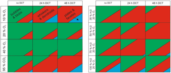 Based on all obtained results and relations, the most optimal environment to obtain long whiskers for further applications is an environment with 20% oxygen, 35% humidity level and 48 h of DCT. However, the interesting observation was that despite the absence of oxygen in the presence of CO2 and a moderate level of humidity, similarly long whiskers can be induced for the 48 h DCT sample. The possible reason for this is the strong contribution of the internal stresses of the material and the lack of oxidation of the pool surface that can obstruct the whisker growth. Furthermore, it is possible that the combination of the CO2-H2O mechanism, as observed by Both and Cheung 2019 [48], could potentially contribute to whisker growth, which will be discussed further in the following sections.