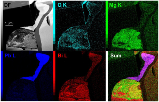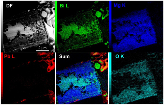 Dark-field (DF) image of the cross-section structure from Figure 7c with corresponding energy dispersive X-ray spectroscopy maps of selected chemical elements. The Sum is the combined color image of Bi L, Mg K and Pb L.