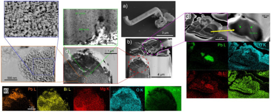 The solid pool of the whisker shows clearly the separation of the different phases as before, but in this case, the Pb and Bi regions are caught to be intermixed and provide a more realistic image of the state from which the whiskers are generally expected to grow. The Pb regions display a sponge-like structure and are surrounded by a Bi region below and an oxide layer above (Figure 6d,e). The Bi regions also hold small Bi2Mg3 crystallites, which are marked in the green enlargement. The Bi regions also display a sub-region which higher porosity (orange enlargement of Figure 6d), which is considered to be the main source of stress-build-up within the pool through oxidation. This exemplar structure of the pool also clearly shows the reason for the variable whisker growth and nucleation, as the different structures of the Bi regions can contribute differently to the rate of oxidation and volume expansion with the time that additionally drives the whisker growth.