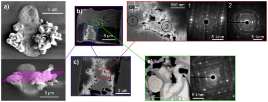 The sample surface and exerted structures were imaged with the Zeiss CrossBeam 550 (Carl Zeiss AG, Oberkochen, Germany) dual-beam electron microscope. Cross-sections of the selected specimens were performed by Ga+ focused ion beam (FIB) machining, operating the beam at 30 keV energy and currents ranging from 3 nA to 100 pA. Energy dispersive spectroscopy (EDS) was used to measure the chemical composition of the specimen using an OctaneElite EDS detector (EDAX, Mahwah, NJ, USA).