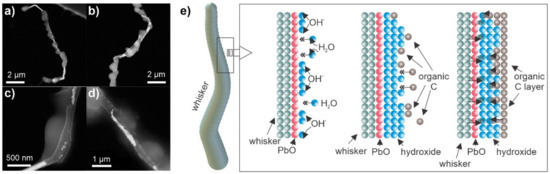 - Significant whisker reformation occurs under a high-humidity and high-oxygen environment with a longer exposure time of upwards of several days. Under these conditions, the simultaneous oxidation and hydration of the whisker surface occur, resulting in the formation of a carbon-rich sponge-like structure. The structure originates from the leaching of Pb to the surface due to the enrichment of the surface with carbon and hydroxides. The resulting sponge-like structure is a very promising formation for the development of high-surface holding materials for catalytic or sensor applications.