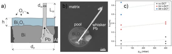 Here, the ratio of whisker and pool diameter and whisker length can be determined from SEM images (example in Figure 10b). In our case, the ratio was found to be 0.05, and the average whisker lengths were taken for each sample individually from the data provided in Supplementary Table S2. The value of relative expansion ∆V⁄V is determined as 0.38 (Cucka et al. (1962) [51] and Blower et al. (1988) [52]). The thickness of the Bi2O3 layer is influenced by the partial pressure of oxygen surrounding the sample surface. Therefore, if the theory of oxidization-driven whisker growth is correct, the thickness of the oxide layer, calculated directly from whisker length and partial pressure of oxygen, should be correlated. We have taken the cases with RH = 0% from our set of measurements since the inclusion of H2O might complicate this behavior and oxidation dynamics. The calculated oxide thickness as a function of partial pressure of oxygen pO2 is shown in Figure 10c. The data shows a correlation between higher oxidation thickness with higher pO2. There is a notable distinction between no-DCT and 24 h-DCT samples, so in order to determine the correlation, the two samples should be separated. The correlation factors of these data points were calculated to be 0.43 and 0.78 for no-DCT and 24 h-DCT samples, respectively. This relatively strong correlation for both samples supports the proposed mechanism of oxidization-driven whisker growth. The correlation of 24 h-DCT is stronger than for no-DCT, but the reasoning behind this is as of yet unknown and more research is needed to understand this relation.