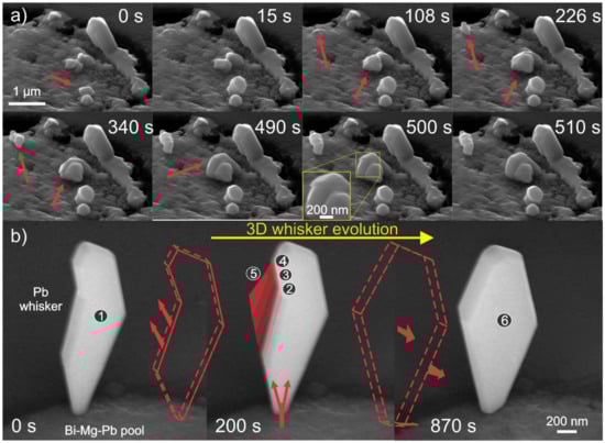 Another example of the interesting segmented growth behavior is presented in Figure 11b. In this case, the growth of the more faceted whisker form is monitored, which reveals that growth can occur not only in a stepwise motion along the length but also along the width or portion of the structure. As can be seen from the image sequence and Supplementary Video S2, the structure grows in a manner similar to that of dislocation stepping. The phenomenon is much more fascinating when the growth base dimensions are compared to the dimension of the structure, which follows the extremely high material throughput through the narrow base in order to accommodate such large changes in the structure. The stepwise motion depicted in the middle image of Figure 11b supports the agglomeration of the material within the structure and the relaxation of the built-up pressure again through the extension of the structure. Interestingly, once the structure reaches an energetically preferred form through faceting, the whole structure enlarges in a monotonic fashion in all directions. Such behavior provides evidence of the continuous flow of the material into the erupted structure and that the surface energy plays an important role in the preferred growth direction and morphology, which is also confirmed by other authors on Sn-whisker growth [33]. The volumetric difference analysis indicates that the stepwise growth corresponds to a volume change of 0.023 µm3 in 200 s and the monotonic growth corresponds to a 0.05 µm3 broadening within the 670 s, corresponding to 115 × 10−6 to 75 × 10−6 µm3/s volume growth, respectively. The evaluated growth velocities correlate well to expected whisker growth rates determined from modelling by Chason et al. [8].