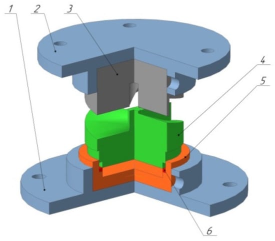 General view of the complete construction: 1—bottom carrier, 2—top carrier, 3—upper striker, 4—lower striker, 5—matrix, and 6—piston ring.