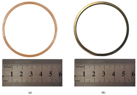 Rings of face seals are usually made of deformable brass of LZhMts59-1-1 grade (58.0-Cu; 40.0-Zn; 0.9-Fe; 0.7-Mn; 0.4-Al, weight %), so the laboratory experiment was carried out just on this material. The initial workpiece had a ring shape with a diameter of 55 mm, a width of 3 mm and a thickness of 3 mm. Brass grade LZhMts59-1-1 refers to manganese brass and has a high ductility and high strength. The alloy’s high ductility is due to the fine grain structure resulting from its alloying with iron. This brass is also highly corrosion resistant in seawater and atmospheric conditions, is quite ductile at high temperatures, so it withstands hot deformation well and is satisfactorily pressure treated at room temperature. It has good antifriction properties. Since this brass in the initial state has a two-phase structure α + β, which has low ductility, so in order to reduce the initial grain size, the ring workpieces were subjected to preliminary heat treatment. The preheating treatment consisted of annealing the brass at 600 °C and slow cooling together with the furnace.