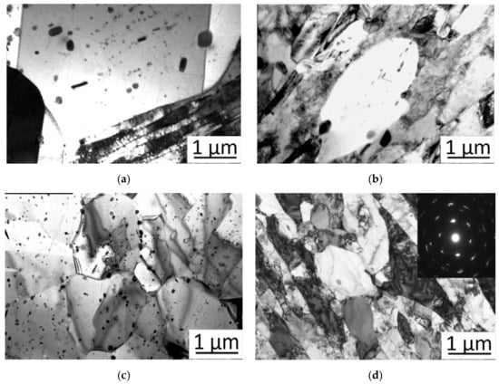 The microstructure of brass in the initial state (after annealing) consists of α-phase (Figure 5a) where α-phase is a solid solution of zinc substitution in copper with a FCC lattice, which has high ductility, low strength, and hardness values. In the copper matrix there is a small amount of nanosized iron particles. As the number of deformation cycles increases, the β’-phase, an ordered solid solution based on CuZn intermetallic with a BCC lattice, begins to appear in the structure. This phase is characterized by higher hardness and brittleness than α-phase.