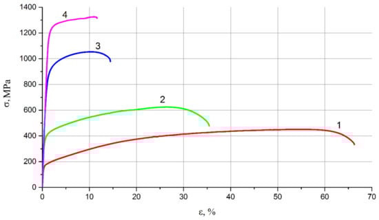 After annealing, the brass samples have an extended strain-hardening area (Figure 7, curve 1). As the number of deformation cycles increases, the strain-hardening area decreases. By analyzing the tensile diagrams, we can conclude that with an increase in the number of deformation cycles, the strength and yield strengths increase. Thus, the ultimate strength of the initial sample (after annealing), (Figure 7, curve 1), is 430 MPa, after two cycles of deformation (Figure 7, curve 2)—610 MPa, after four cycles of deformation (Figure 7, curve 3)—1050 MPa and after the sixth cycle (Figure 7, curve 4)—1295 MPa. The yield strength increases from 130 MPa in the initial state to 332 MPa, 805 MPa, and 1185 MPa, respectively. The plastic characteristics decrease with increasing number of deformation cycles, so the percentage elongation decreases from 65% in the initial state to 36% after the second cycle, to 15% after the fourth cycle and to 12% after the sixth cycle of deformation. This low percentage elongation shows that further deformation will make it absolutely brittle and not applicable in production without further heat treatment, so we do not increase the number of deformation cycles anymore.
