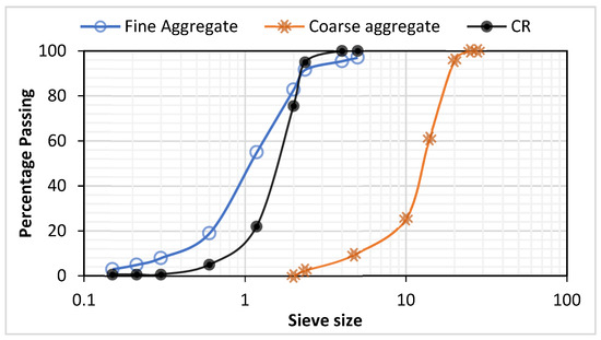 Grading curves for the aggregates and crumb rubber (CR).