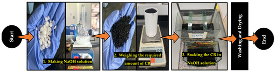 The pretreatment process is presented in Figure 2. This procedure was adopted from previous works on the use of NaOH for CR pretreatment [27,35,38]. In this research, three levels of NaOH pretreatment concentrations were considered. The first level is the control group, where the CR was used without any form of pretreatment considered as 0% concentration. The second and third groups were those pretreated with 5% and 10% solutions of NaOH, respectively. The process started by making a solution of the desired concentration. The CR was then soaked in the solution for 24 h, followed by washing with tap water until the PH became neutral. This step was followed by air drying the washed CR at an ambient temperature. The dried pretreated CR was then used in the concrete mix based on the generated RSM mix proportions.