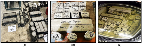 (a) Concrete samples after casting. (b) Demoulded samples ready for curing after labeling. (c) Test samples in curing tank.